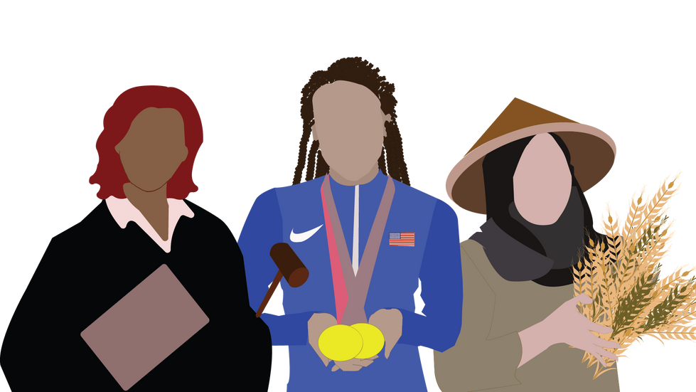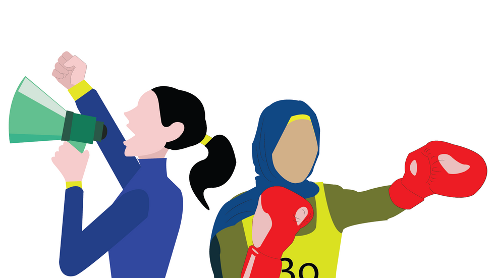 The design features a grid of illustrated, diverse female figures—each representing different identities, styles, and backgrounds—to visually communicate inclusivity and the wide spectrum of Muslim women’s experiences. Bold typography paired with a clean white backdrop ensures strong readability, while the gold accents add a refined, authoritative touch suitable for a scholarly yet accessible work.